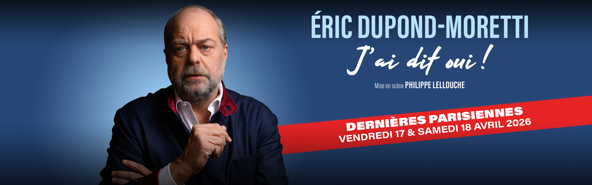 Après le triomphe de son premier spectacle, Éric Dupond-Moretti revient sur scène avec « J’ai dit oui ! » pour des dernières dates exceptionnelles au Théâtre Marigny.